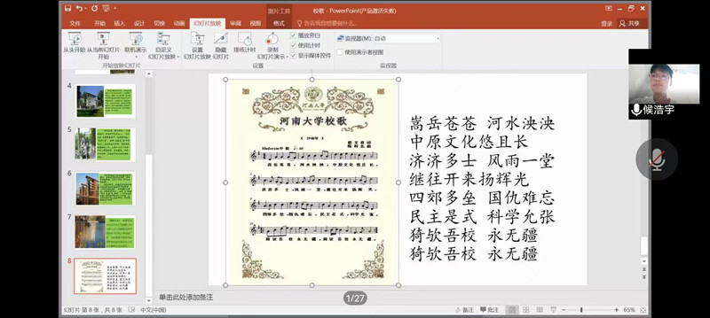 9月3日下午是“學(xué)唱校歌”專(zhuān)題,魏森杰向新生同學(xué)詳細(xì)講解了河南大學(xué)校歌的創(chuàng)作背景與創(chuàng)作過(guò)程,隨后,她帶領(lǐng)同學(xué)們一起學(xué)唱校歌,“嵩岳蒼蒼,河水泱泱,中原文化悠且長(zhǎng)。濟(jì)濟(jì)多士,風(fēng)雨一堂,繼往開(kāi)來(lái)?yè)P(yáng)輝光。四郊多壘,國(guó)仇難忘。民主是式,科學(xué)允張。猗歟吾校,永無(wú)疆。猗歟吾校,永無(wú)疆!”那雄渾激昂的旋律,蘊(yùn)涵著以自強(qiáng)不息、百折不撓為核心的大學(xué)精神,在欣賞和學(xué)唱的過(guò)程中,新生同學(xué)為之深深感動(dòng),沉浸其中。