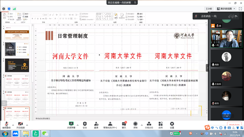 9月4日上午是“規(guī)章制度專(zhuān)題”,學(xué)院黨委副書(shū)記趙艷忠按照“日常管理類(lèi)制度”“獎(jiǎng)勵(lì)類(lèi)制度”“處罰類(lèi)制度”,帶領(lǐng)同學(xué)們重點(diǎn)學(xué)習(xí)了《河南大學(xué)全日制普通本科學(xué)生管理規(guī)定》《河南大學(xué)全日制普通本科學(xué)生學(xué)籍管理規(guī)定》《河南大學(xué)全日制普通本科學(xué)生考勤與請(qǐng)銷(xiāo)假管理辦法》《河南大學(xué)全日制普通本科學(xué)生獎(jiǎng)勵(lì)辦法》《河南大學(xué)全日制普通本科學(xué)生國(guó)家獎(jiǎng)助學(xué)金管理辦法》《河南大學(xué)全日制普通本科學(xué)生違紀(jì)處分辦法》等規(guī)章制度,并要求同學(xué)們?cè)谌雽W(xué)教育期間,自主學(xué)習(xí)其他規(guī)章制度。他希望同學(xué)們遵規(guī)守紀(jì),堅(jiān)守底線,不觸紅線,奮發(fā)有為,不負(fù)青春韶華。