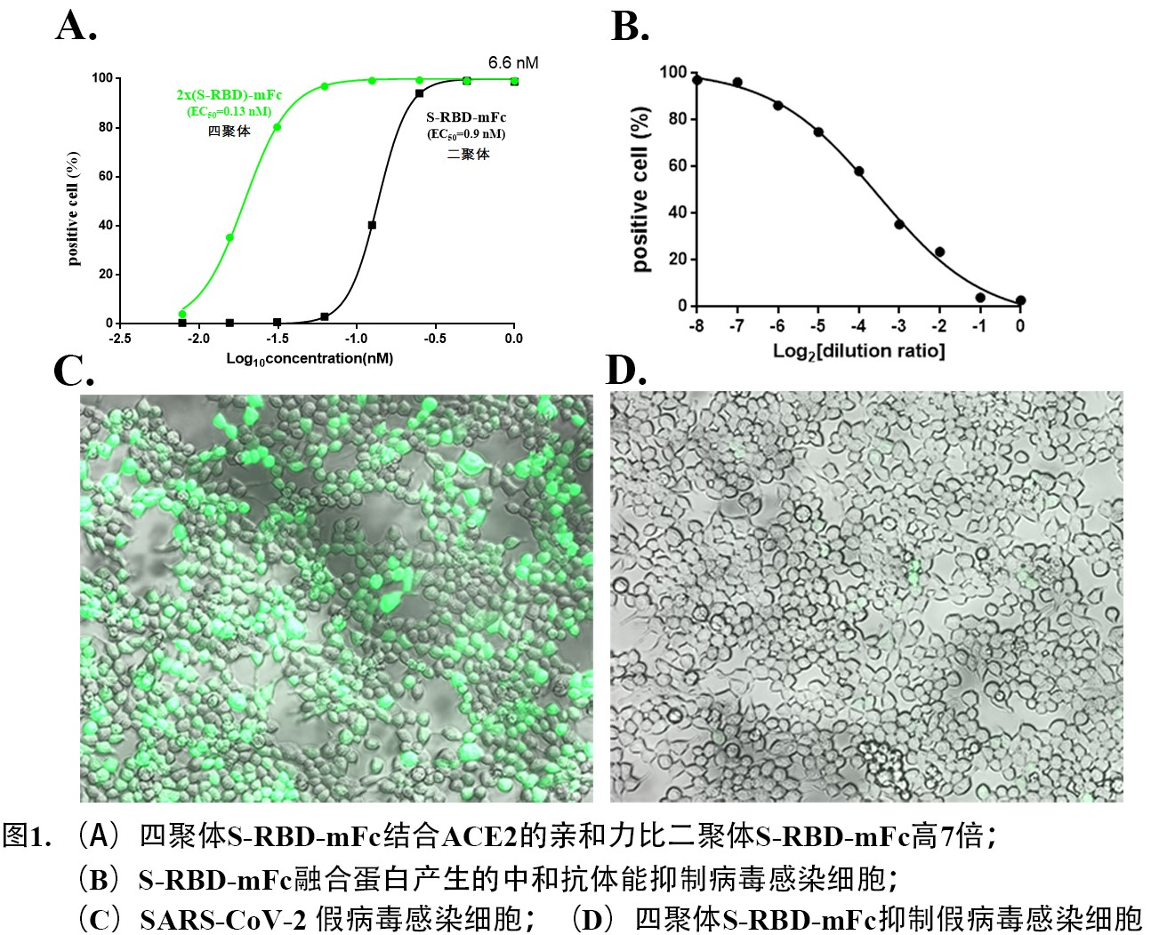 王彥明教授團隊對COVID-19病毒觸棘(S)蛋白的受體結(jié)合區(qū)域(RBD)進行研究,開發(fā)了具有自主知識產(chǎn)權(quán)的四聚體S-RBD-Fc抗體融合蛋白,建立了安全的假病毒感染HEK293T-hACE2細胞體外研究體系。研究發(fā)現(xiàn),通過競爭抑制S-RBD和其細胞表面受體ACE2的結(jié)合,四聚體S-RBD-Fc抗體融合蛋白在0.13 nM濃度下能抑制50%的假病毒感染,抑制活性比二聚體S-RBD-Fc抗體融合蛋白高7倍。同時發(fā)現(xiàn),抗體融合蛋白免疫小鼠后產(chǎn)生的S-RBD中和抗體能有效抑制假病毒的感染能力,并且對新出現(xiàn)的變種Omicron S蛋白假病毒具有抑制作用。抗體融合蛋白通過給藥后能直接抑制病毒感染和后期產(chǎn)生中和抗體兩個機制,實現(xiàn)“一石二鳥”的預(yù)防和治療效果。四聚體S-RBD-Fc抗體融合蛋白具有更高的受體親和力等技術(shù)優(yōu)勢,為應(yīng)對現(xiàn)有新冠病毒及其新變種提供了一個潛在的周期短、靈活、有效的抗體融合蛋白研發(fā)方向。
